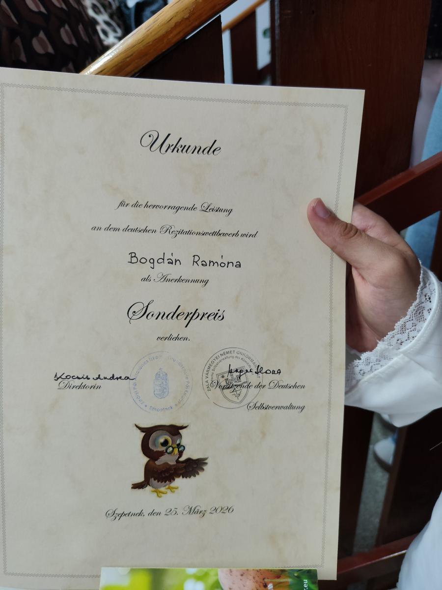 A Letenyei Andrássy Gyula Általános Iskola 6. b osztályos tanulója, Bogdán Ramóna 2026. március. 25-én részt vett Szepetneken a Királyi Pál ÁMK és a Szepetneki Német Nemzetiségi Önkormányzat által megrendezett VII. térségi versmondó versenyen.